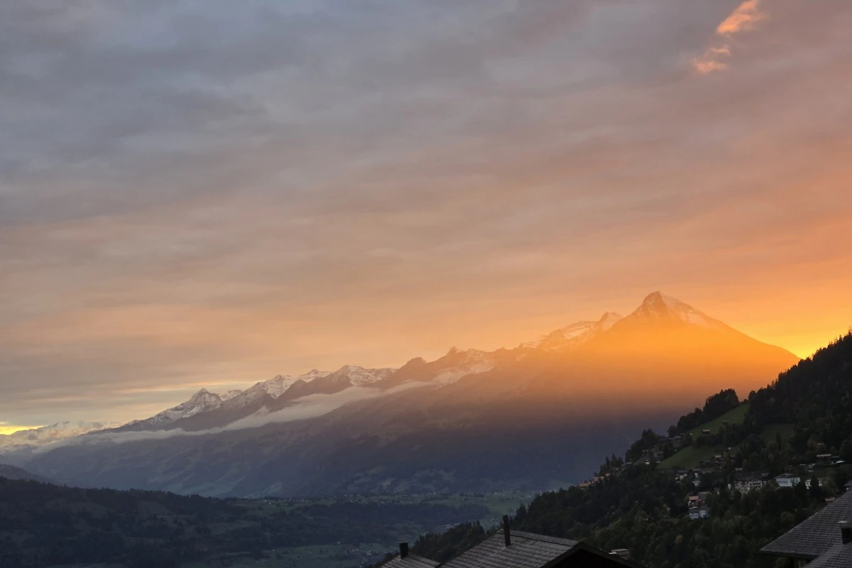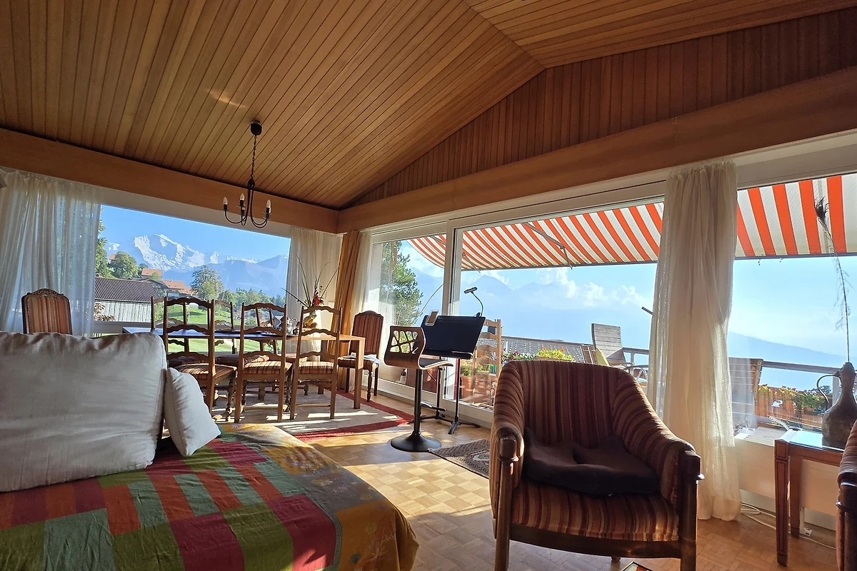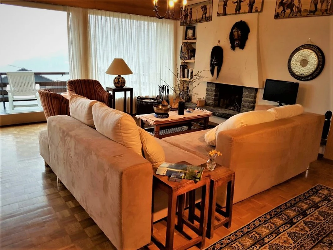 Il grande soggiorno e l’enorme terrazza con vista fino alle Alpi Vallesi fanno sognare. Ancor di più, se la sera o in inverno anche di giorno lasciate scoppiettare il fuoco nel camino aperto.
