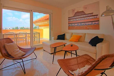 Situato in posizione ideale sull'ampio lungomare pedonale di Marbella, questo appartamento d'angolo all'ultimo piano offre una fantastica vista sulla spiaggia, sul porto e sul mare fino a Gibilterra da due balconi soleggiati