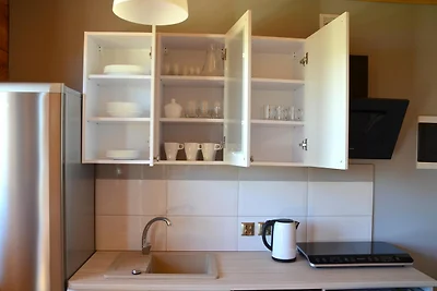 Pianterreno: (Angolo cottura(piano cottura(2 fuochi, induzione), bollitore, tostapane, caffettiera, forno a microonde, frigo con congelatore)