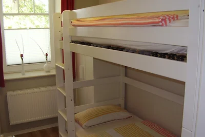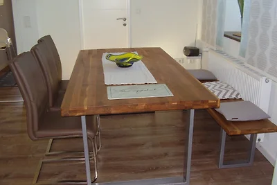 Maisonette per vacanze con terrazza sul tetto di 16mq in posizione centrale a Dornumersiel, spazio generoso per 4 persone e bambino, cane ammesso. Finestre con persiane.