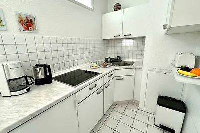 Appartamento per vacanze modernamente arredato in Haus Berolina, per 2 persone vicino alla spiaggia. Cucina, bagno, soggiorno/camera da letto, balcone, 2 posti auto in casa, piscina in casa.